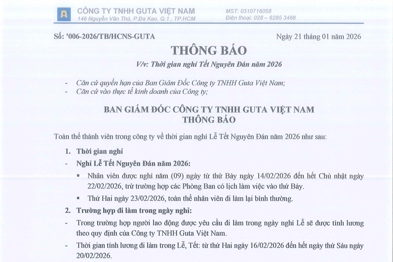 THÔNG BÁO THỜI GIAN NGHỈ TẾT NGUYÊN ĐÁN NĂM 2026