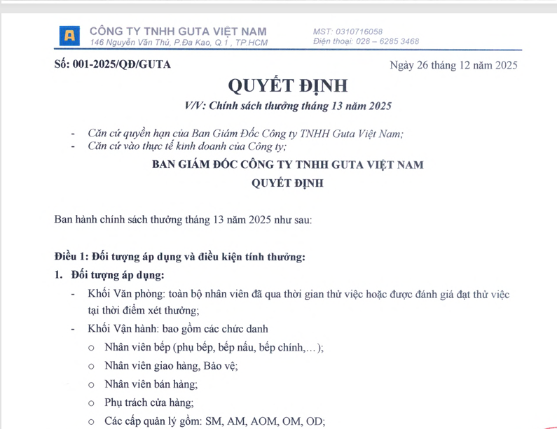 QUYẾT ĐỊNH CHÍNH SÁCH LƯƠNG THƯỞNG THÁNG 13/2025